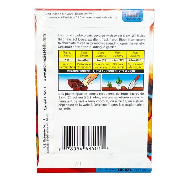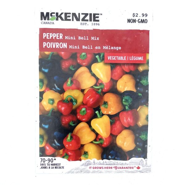 Mini Bell Peppers grow on short and stocky plants covered with sweet 5 cm (2″) fruits. The delicious 2-3 lobe peppers have an excellent fresh flavor. Depending on the variety, peppers will ripen from green to chocolate to red or yellow.