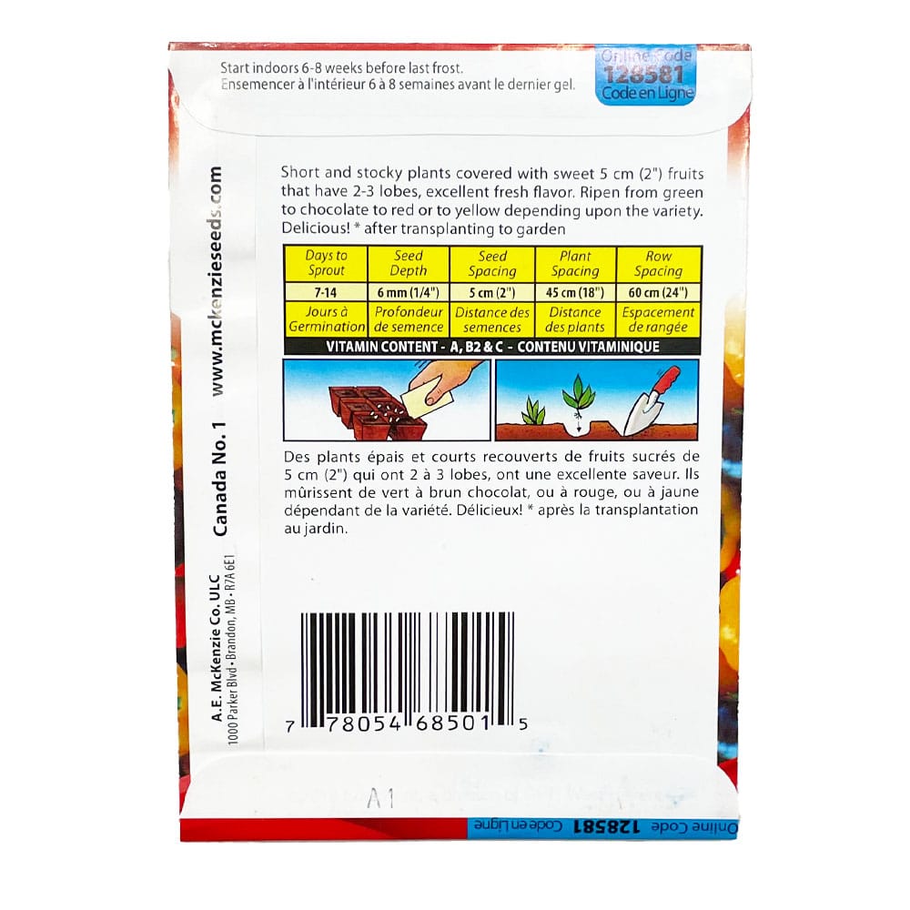This Mini Bell Peppers Mix grow on short and stocky plants covered with sweet 5 cm (2″) fruits. The delicious 2-3 lobe peppers have an excellent fresh flavor. Depending on the variety, peppers will ripen from green to chocolate to red or yellow.