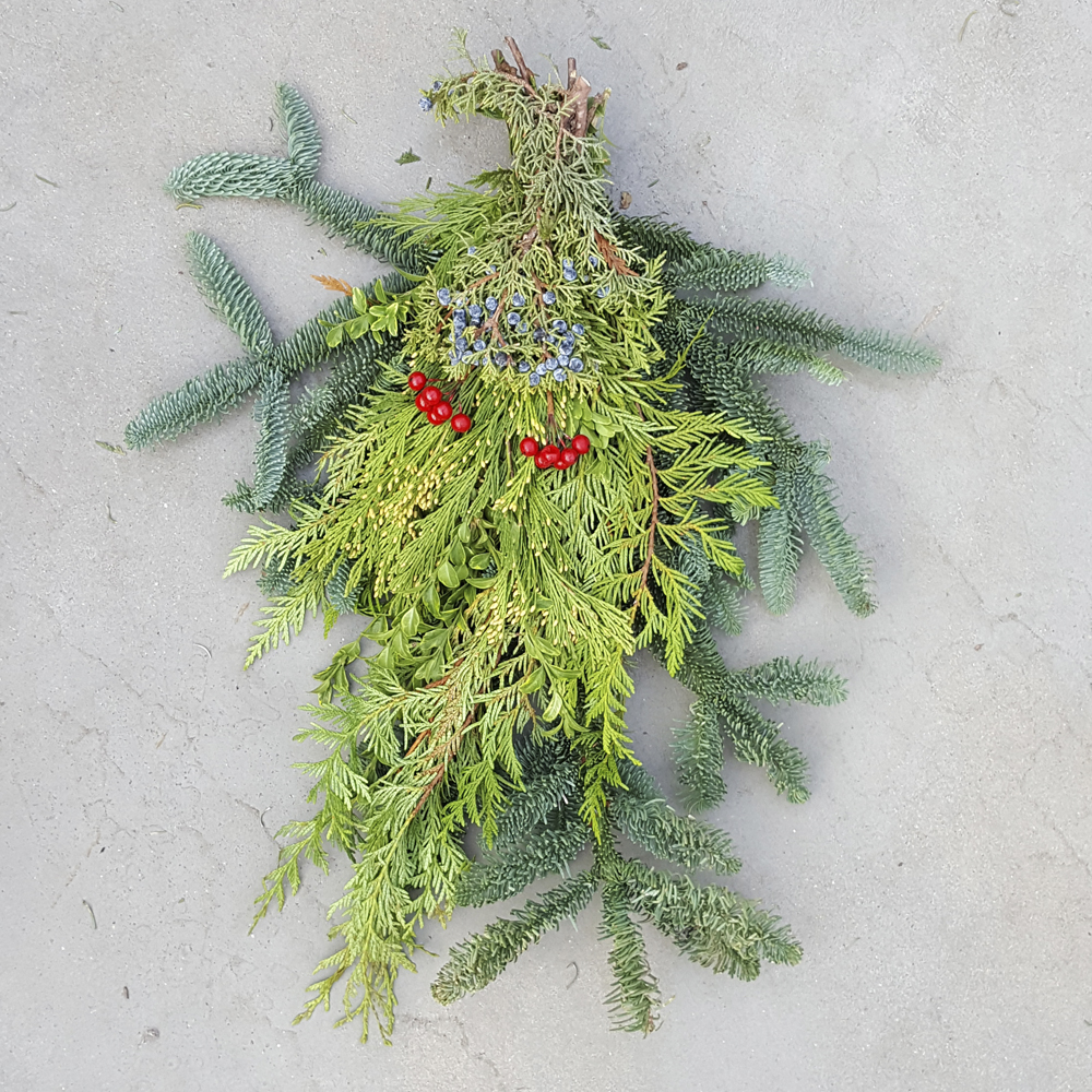Give your front door the festive treatment with a holiday door swag of mixed greens complete with an assortment of berries.