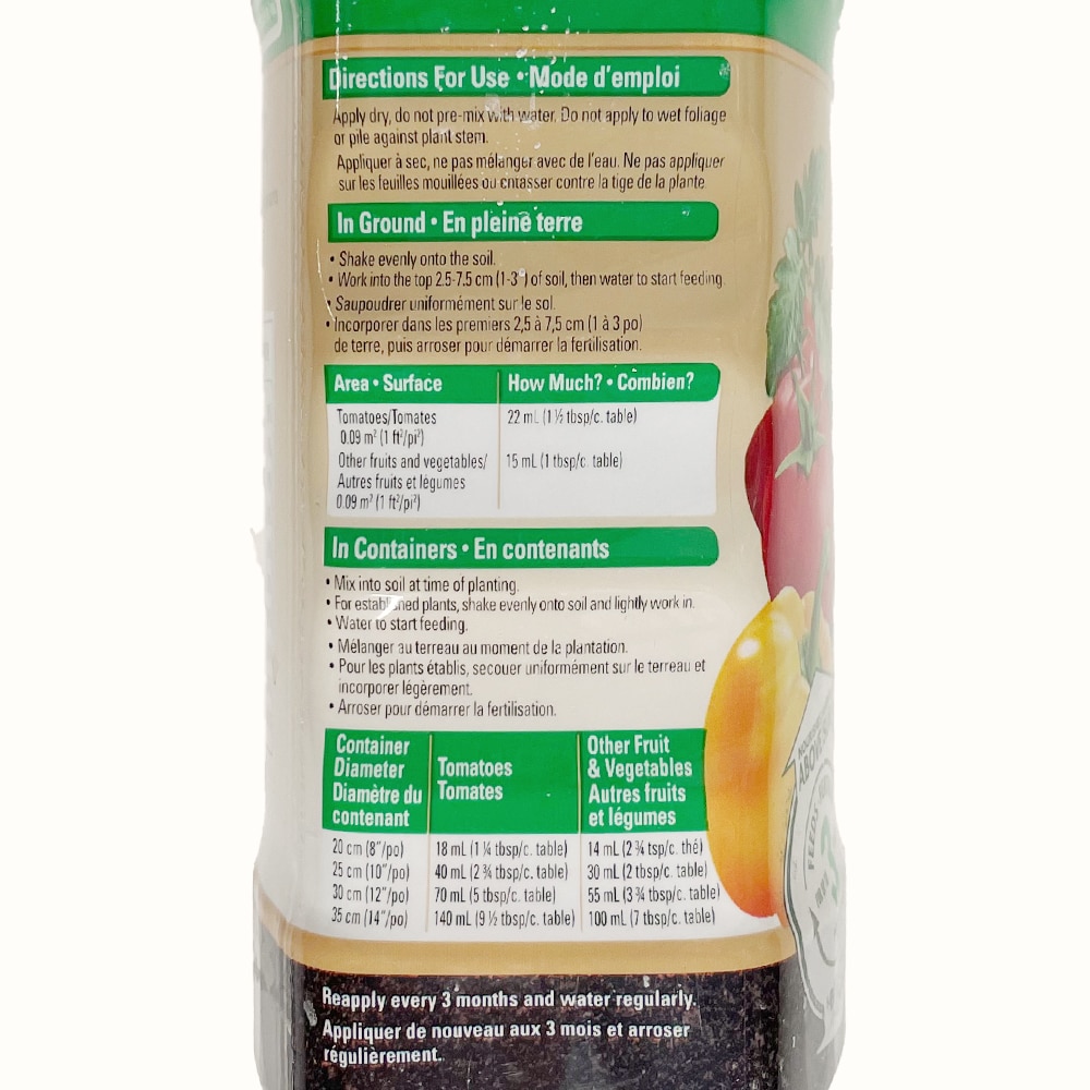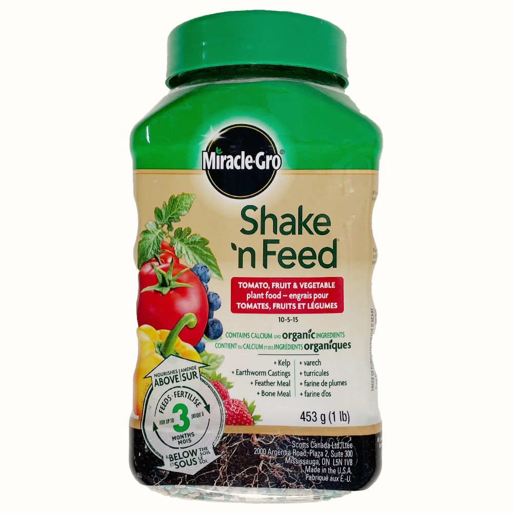 Made for tomatoes, fruits and vegetables. This slow release plant food contains micronutrients. For example, it includes calcium for higher quality fruits and vegetables. Feed lasts for up to 3 months. Miracle-Gro Shake ‘n Feed Fruit & Vegetable is good for in-ground and container gardens.