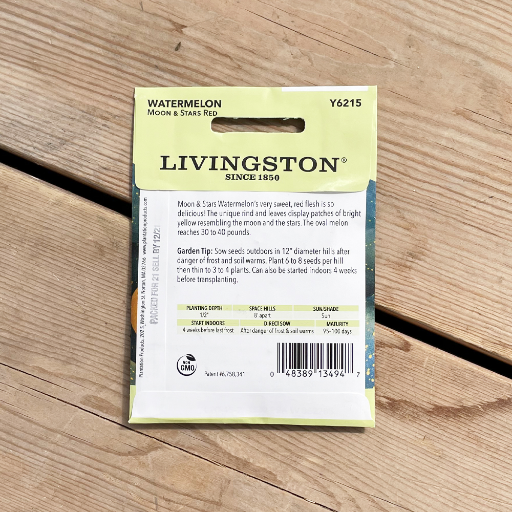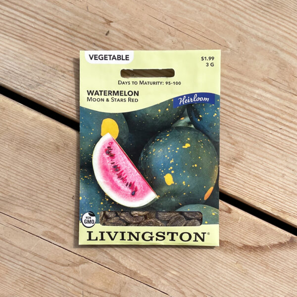 Moon & Stars Watermelon’s vert sweet, red flesh is so delicious! The unique rind and leaves display patches of bright yellow resembling the moon and stars. The oval melon reaches 30 to 40 pounds.