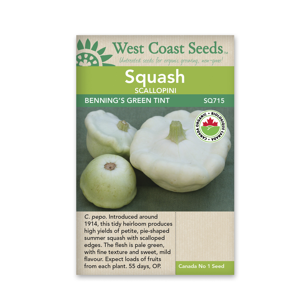 C. pepo. Bennings Green Tint scallopini seeds are CERTIFIED ORGANIC! Benning’s Green Tint pattypan squash (or scallopini squash) is a pretty little pale-green, almost white, elegant scallopini that grows on a tidy, productive bush. We recommend harvesting these squash a day or two after pollination, when the fruits are tiny and tender, with very appealing flavour raw or cooked. If left to mature, Benning’s develops a “belly” that can be carved into a unique serving dish for summer soups and salads. This is an old heirloom variety that was first introduced around 1914. The plants do not sprawl, but they can be tall, so keep a close eye for fruits forming beneath the foliage.