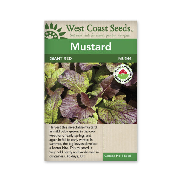 CERTIFIED ORGANIC! When small, the lovely burgundy coloured leaves with light green veins are so mild and delicious they can be eaten in salads. In summer, big leaves pack a proper mustard punch but they are much milder when cooked or when grown in cooler weather. Very winter-hardy, Giant Red Organic mustard seeds can be planted into October or in early spring to harvest as small leaves every few days. For big plants, thin to 20-30cm (8-12″) in the row.