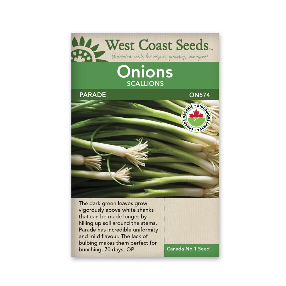 Parade Organic scallion seeds are CERTIFIED ORGANIC! For an open pollinated variety, Parade shows remarkable uniformity, with little or no bulbing. Dark green, almost waxy leaves grow vigorously with white stalks that can be made longer by hilling up soil around them. Expect upright growth with no branching. Parade looks great as a bunching onion on the market table, but it performs perfectly in the home garden. Provide frost protection with a cloche tunnel, and you can harvest this scallion all winter long. Parade is one of the best scallions to grow if you plan on saving seeds for next season. To do this, wait for some of your scallions to overwinter. Their flowers are formed after a cold period. Be aware that they can cross pollinate with other members of Allium fistulosum as well as A. cepa, so they need to be isolated if both are in bloom at the same time.