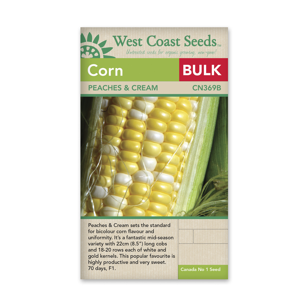 This fantastic mid-season bicolour hybrid produces 22cm (8.5″) long cobs, each with 18-20 rows each of white and gold kernels. The kernels actually produce two different flavours in every bite. Peaches and Cream corn seeds produce productive, 2m (6′) tall plants and very sweet cobs. Peaches and Cream has earned its popularity for gourmet flavour, sweetness, and tender, fine kernels. We highly recommend it for the home gardener. But be sure to wait until the soil is 21°C (70°F) before planting our untreated corn seeds – this is crucial for good germination of all super sweet hybrid corn varieties.