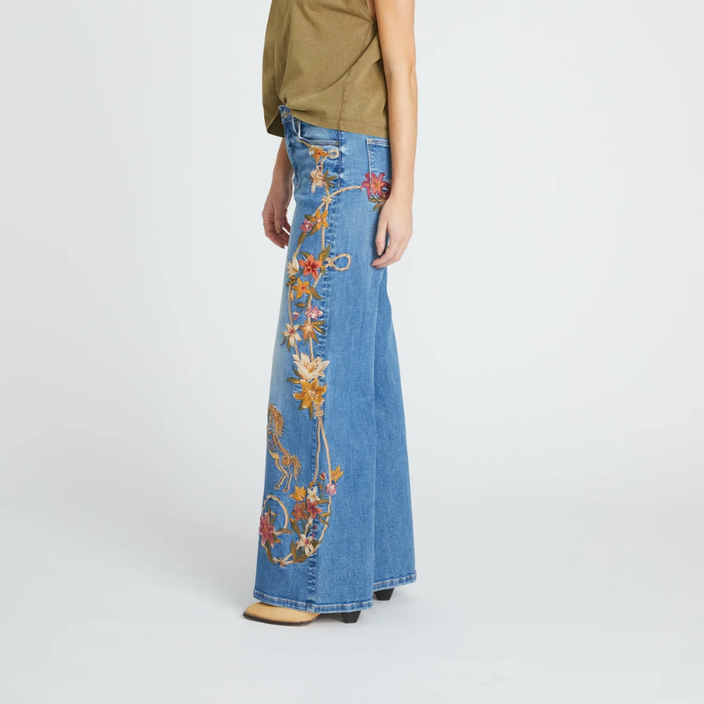 Rodeo-inspired with a feminine twist, The Penelope is a wide-leg denim that makes a statement. Set in a versatile medium wash, this style is detailed with Lillies & Lassos embroidery — a mix of florals in rosy pink, orange, and cream, alongside a striking horse motif. Designed for bold expression, it’s the perfect blend of Western spirit and modern denim.
