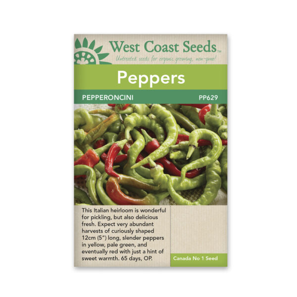 An Italian heirloom, Pepperoncini pepper seeds produce bushy and vigorous plants that yield prodigious quantities of slender 12cm (5″) peppers. They start green and as they turn red, become even sweeter. The rich taste is like a sun-dried tomato with just a tiny hint of warmth. Pepperoncini is wonderful for eating fresh, chopped in salads, served with dips or breads, or pickled. The rich taste is like a sun-dried tomato with just a tiny hint of warmth. These are not chile peppers in any way. Try this variety it containers – one plant per five gallon container. Use rich, fertile soil with good drainage.
