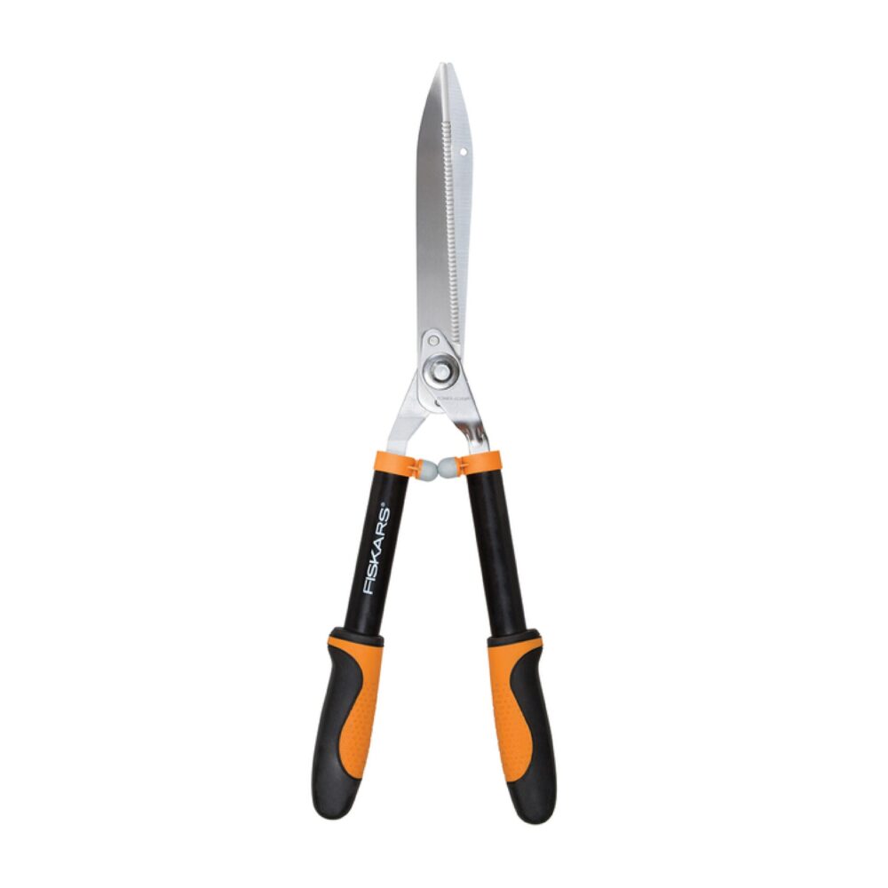 Our Power Lever Chrome Hedge Shears by Fiskars use compound lever technology to provide two times more cutting power than single-pivot shears. The self-sharpening, precision-ground, 10-inch steel blades feature a Gator-Blade(R) serrated edge that grips branches and provides clean cuts. These hedge shears are comfortable to operate thanks to the low-friction blade coating and shock-absorbing, vibration-reducing bumpers. Softgrip handle sleeves are easy to grip and control through every cut.