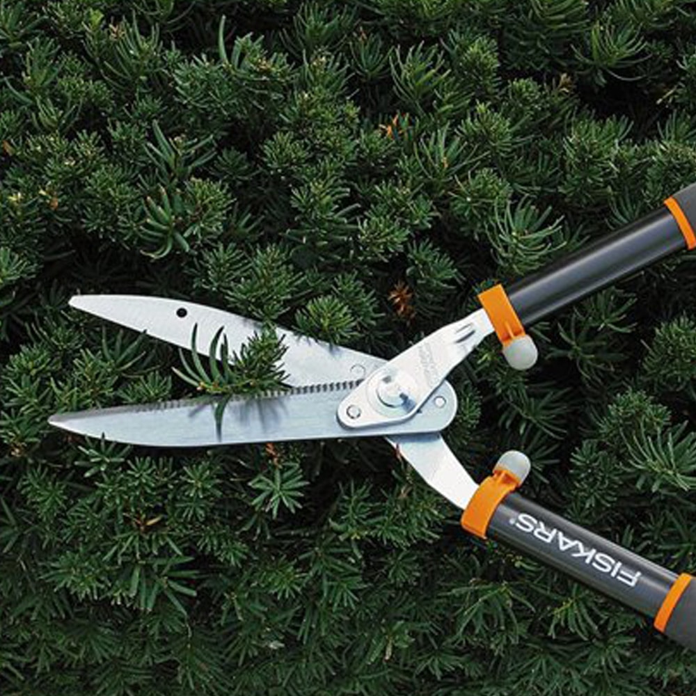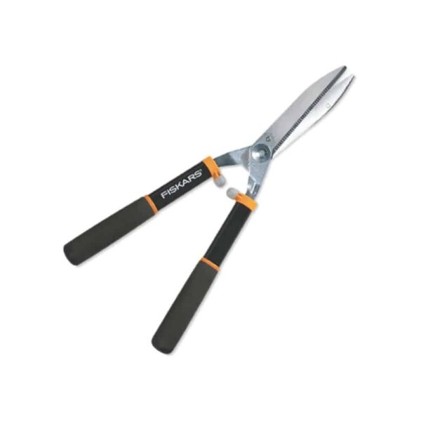 Our Power Lever Hedge Shears by Fiskars feature compound lever technology to give you up to two times more cutting power than traditional shears. Precision-ground steel blades feature a serrated edge to grip while cutting, and a patented self-sharpening design ensures that every cut is clean and crisp. A rust-resistant, low-friction coating makes every cut even easier, shock-absorbing bumpers absorb jarring vibrations, and durable steel handles with non-slip grips offer control. A gardener’s essential!