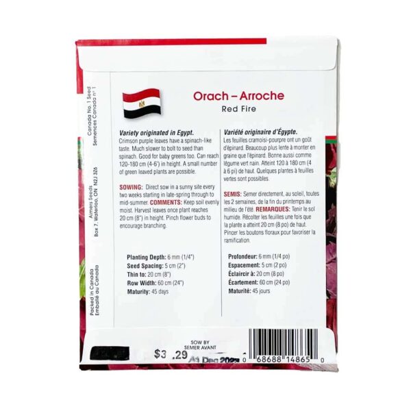 Red Fire Orach has crimson purple leaves with a spinach like taste. Much slower to bolt to seed than spinach. Good for baby greens too! Can reach up to 180cm in height.