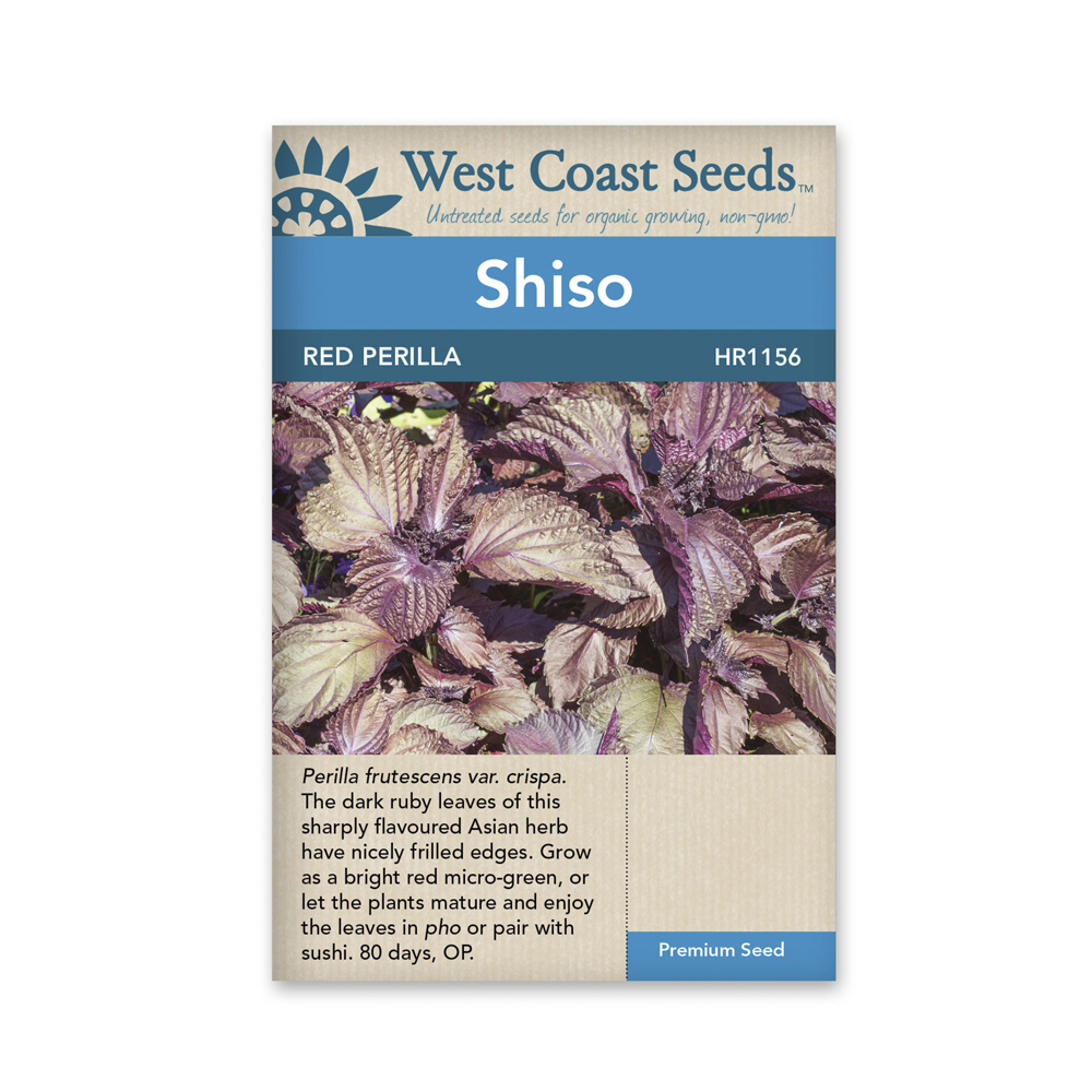 Perilla frutescens var. crispa. Red Perilla shiso seeds grow into substantial plants with wide, deep purple leaves. The dark ruby leaves of this sharply flavoured Asian herb have nicely frilled edges. They look a little bit like stinging nettle leaves, but rounder, and without any prickles. Grow as a bright-red micro-green, or let the plants mature and enjoy the leaves in pho, salad rolls, or other dishes. Shiso makes a wonderful pairing with unctuous dishes like sushi, and it combines beautifully with cilantro, mint, Thai basil and fresh lettuce leaves. Shiso has a very similar growing season to basil, and performs just as well in containers as in the garden bed. Provide full sun and well drained soil.