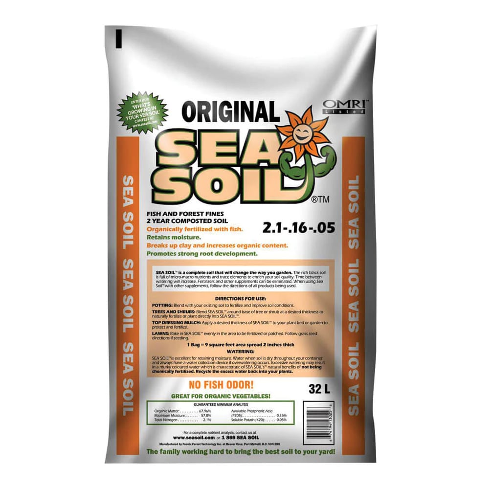 Created from a mixture of fish and forest fines. This top-quality Sea Soil product is rich in colour and in nutrients while maintaining a neutral pH. It contains all necessary micro and macro nutrients to grow a healthy garden, is weed-free, and is an excellent way to retain moisture. Sea Soil is listed by the Organic Materials Review Institute (OMRI). With no fish odour, this two year composted soil is a complete soil for your garden.