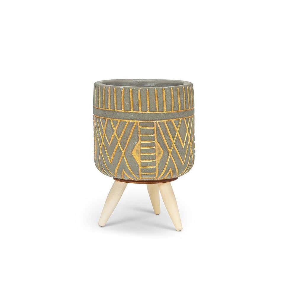 Our small angle tripod pot will give your favourite plant or flowers the unique home they deserve. Crafted out of cement and wood, this grey and gold planter’s modern spin on tribal patterns makes a subtle yet stylish complement to any type of decor. Make sure to stop in at the greenhouse and also buy a plant to go along with your new pot.