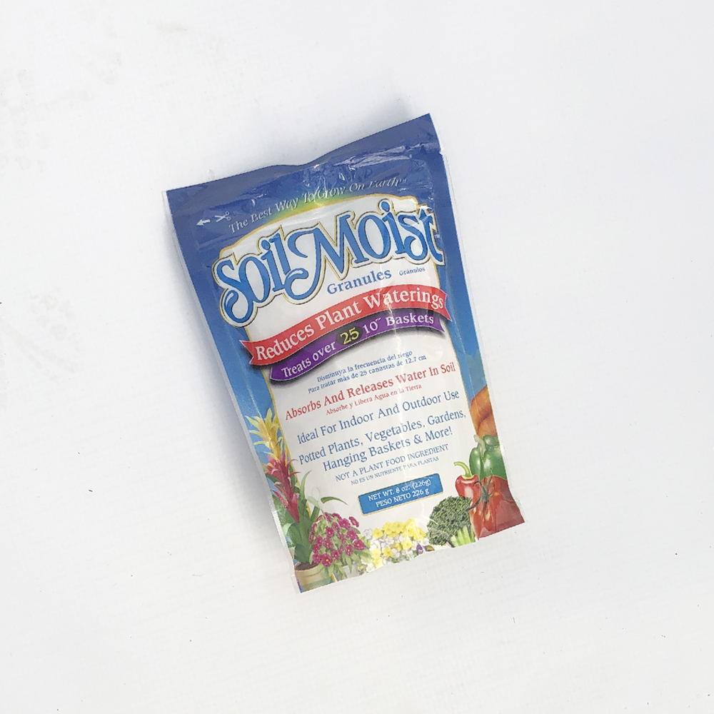 Try our Soil Moist! Polymer granules absorb water, similar to a sponge. When the soil dries, the stored water is gradually released to the soil. This will reduce plant waterings by 50% and last several seasons. It is non-toxic, environmentally friendly, and safe to use on all plants and vegetables.