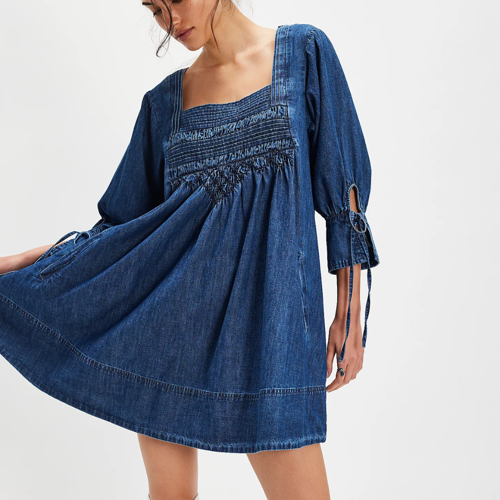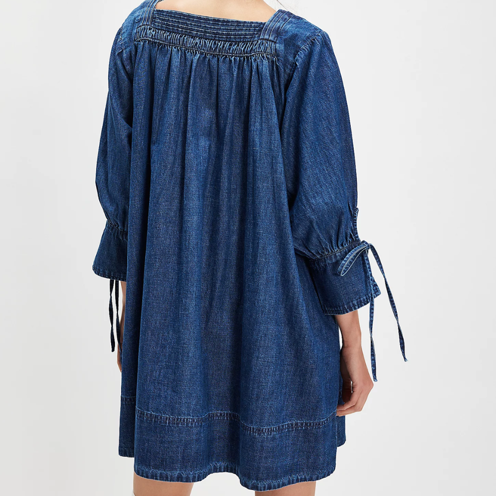 The perfect blend of cool and classic, this totally timeless mini dress is featured in a staple chambray fabrication with a square neckline, slightly puffed long sleeves, and defined detailing at bust for a dimensional finish.