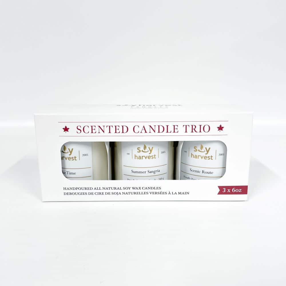 Hand poured in Winnipeg, MB, this trio of candles with envelope your home in the scents of Lake Time, Summer Sangria, and Scenic Route.