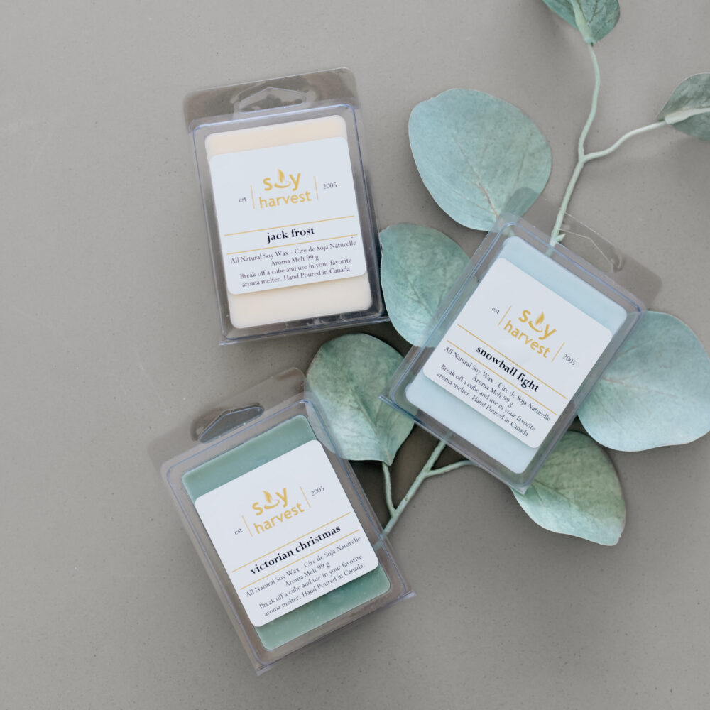 Our favorite, affordable home fragrance format is to use our Soy Harvest Wax Melts – Seasonal Collection. Simply break off a piece of these premium quality wax melts and add them to your favorite burner. Sit back and enjoy as a lovely fragrance fills your home! Soy Harvest products are proudly made in Manitoba and is 100% women owned and operated. They use only the good stuff – all natural soy wax, cotton or natural wooden wicks, and reusable glass jars!