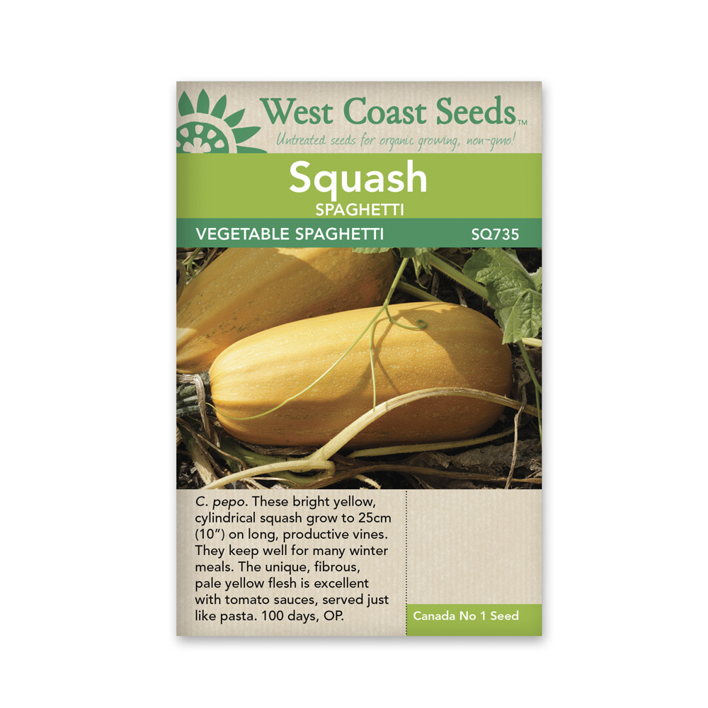 C. pepo. Sow Vegetable Spaghetti squash seeds for fruits that actually appear to be stuffed with cooked spaghetti. The pale yellow, oval fruits grow to 25cm (10″) on long, productive vines. Spaghetti squash seeds keep well for meals right through winter. Boil or bake the whole fruits, and then cut lengthwise down the middle. It’s then easy to fork out the fibrous interior that looks just like pasta. Enjoy it simply seasoned as is, or topped with your favourite pasta sauce. The yellow rind of this squash is smooth and very hard. After the fruits have ripened on the vines, give them a quick wipe down with a highly diluted bleach solution. If the skin is not nicked, the fruits will last for months.