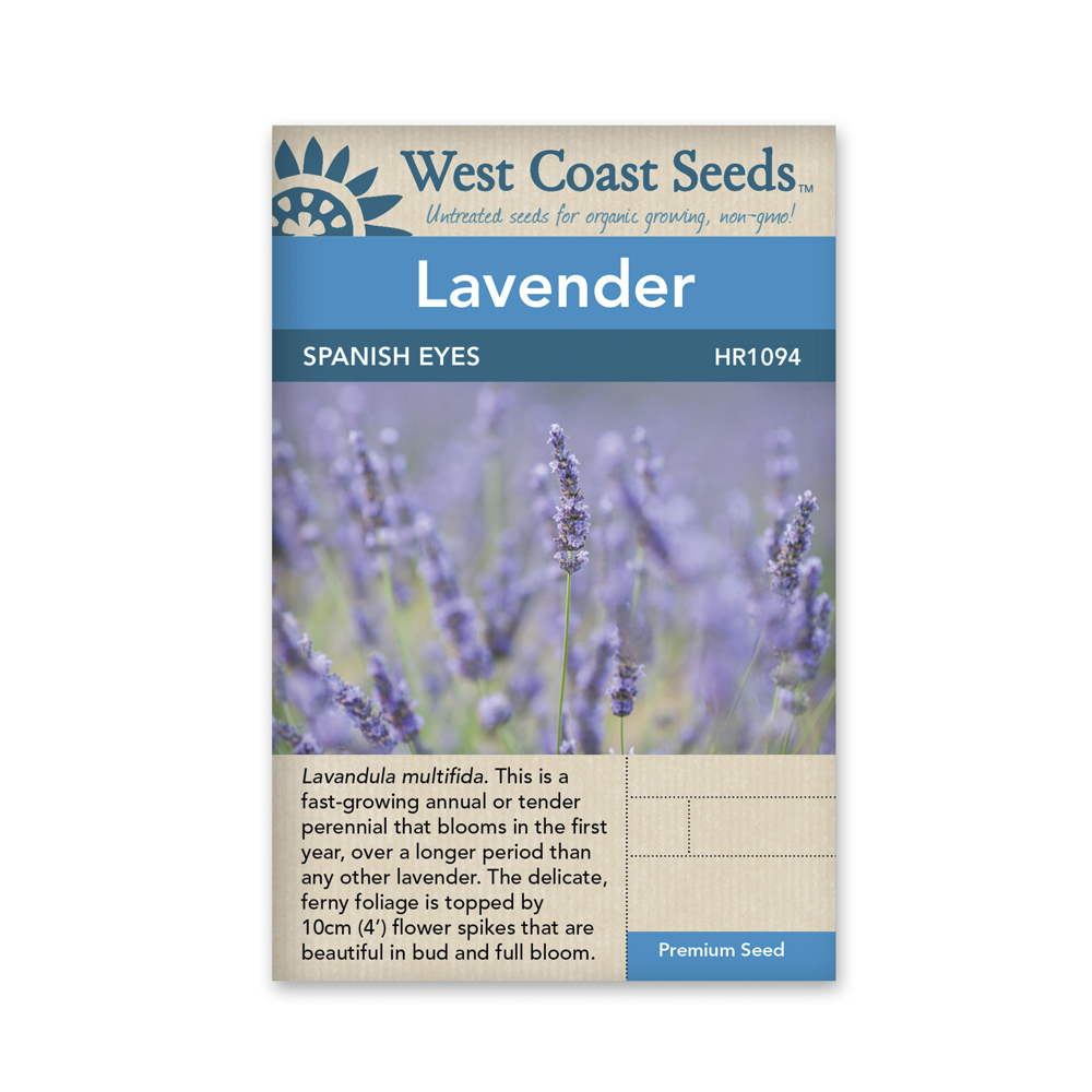 Lavandula multifida. Spanish Eyes Lavender seeds produce fast-growing lavender that blooms in the first year, just eight weeks after germination. It also blooms over a longer period than any other lavender variety. The finely cut fern leaf foliage is topped by branched, 10cm (4′) flower spikes. Beautiful in bud, spectacular in full bloom in the garden or in flower arrangements. Arrange plants in clumps or rows, or grow them in medium to large containers in your patio herb garden. The flowers of Spanish Eyes Lavender are not as fragrant as their French and English counterparts, but they make up for this in early and long lasting blooms.
