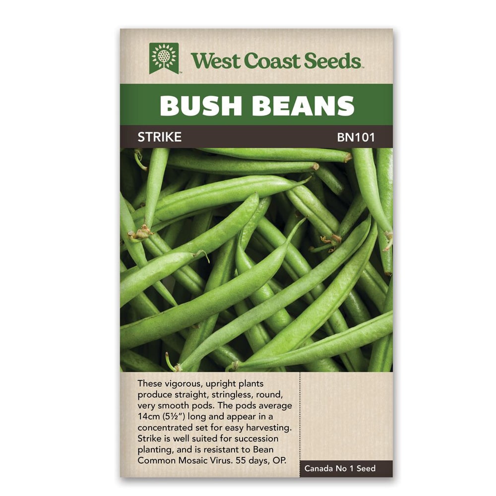 Plant our Strike Bush Bean seeds for productive, upright plants with good disease resistance. The pods are round, medium green, slender, and stringless, coming in a concentrated set for easy harvesting. The beans have a very pleasant texture when cooked, and they maintain their flavour after freezing for winter use.