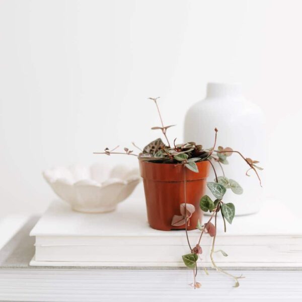 String Of Hearts is a trailing house plant with heart-shaped grey leaves with attractive mottling, and pinkish undersides. In summer it may bear pink, tubular flowers. In nature, every plant is unique! Your actual plant may vary in size and shape from the pictured plant. Comes in a 2.5″ – 3″ pot size.