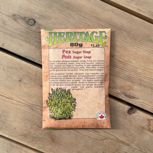 Sugar Snap Peas are an excellent disease resistant variety. The vines provide an abundance of scrumptious, completely edible 8 cm (3″) pods. These heavy yields have a delicious sweet flavor and crisp texture that tastes great raw, stir-fried, steamed or in salads. It is also ideal for freezing.