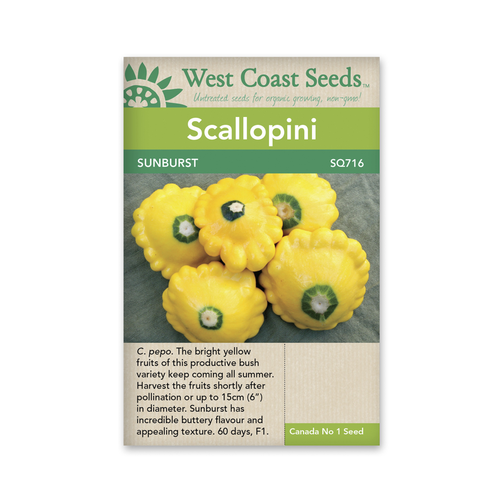 C. pepo. Sunburst scallopini seeds produce a big bush bearing vivid deep yellow pattypans that look like jewels. These dazzling miniatures are best picked at 5cm (2″). Steam them whole or saut̩ée in a little butter. These tasty summer squash remain tender up to about 15cm (6″) in diameter, but we prefer picking them shortly after pollination. The female flowers can also be picked the morning they open and stuffed, with the immature fruit ovary attached at the base. This makes a very striking addition to any gourmet meal, and the edible flowers are mild and delicious. Winner of the RHS Award of Garden Merit.