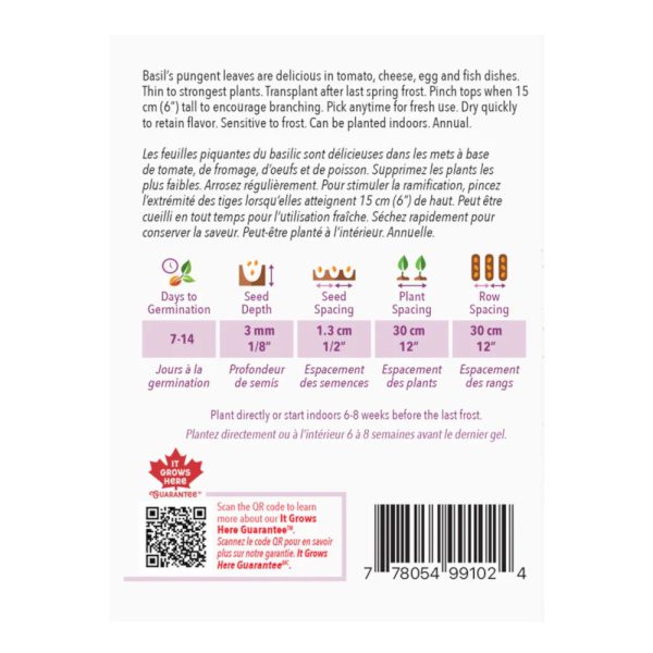 Sweet Basil’s pungent leaves are delicious in tomato, cheese, egg, and fish dishes. Pick anytime for fresh use and pinch tops when 15 cm (6″) tall to encourage branching. This annual herb is sensitive to frost and can be planted indoors.