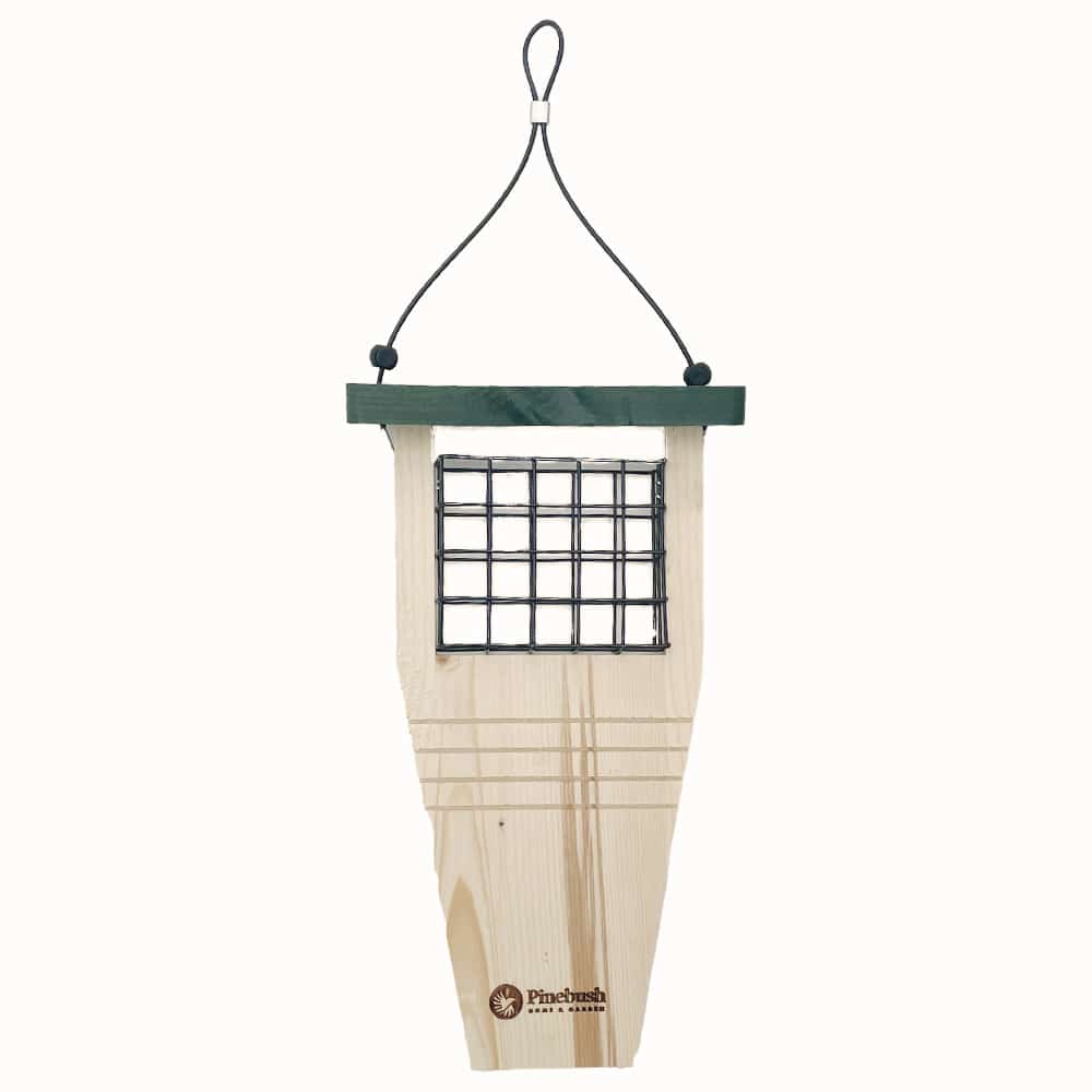 Our Tail Prop Suet Cake Feeder is designed to attract woodpeckers, chickadees, nuthatches and other suet loving birds. Built-in grooves allow birds to easily cling and balance while feeding. Crafted out of sturdy pine, with a lift roof for easy filling and vinyl coated cable hanger.