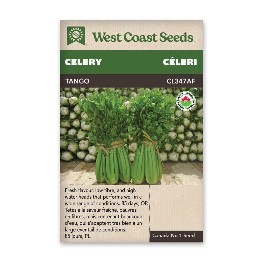Tango Organic Celery seeds are CERTIFIED ORGANIC! Improved breeding makes Tango the celery of choice for a wide range of growing conditions. It excels in southern Canada and the northern US. Its stringless stalks have very little fibre, but have a high water content and keep a remarkably refined taste. The leaves are strongly aromatic and useful in soups and savoury dishes of all kinds.