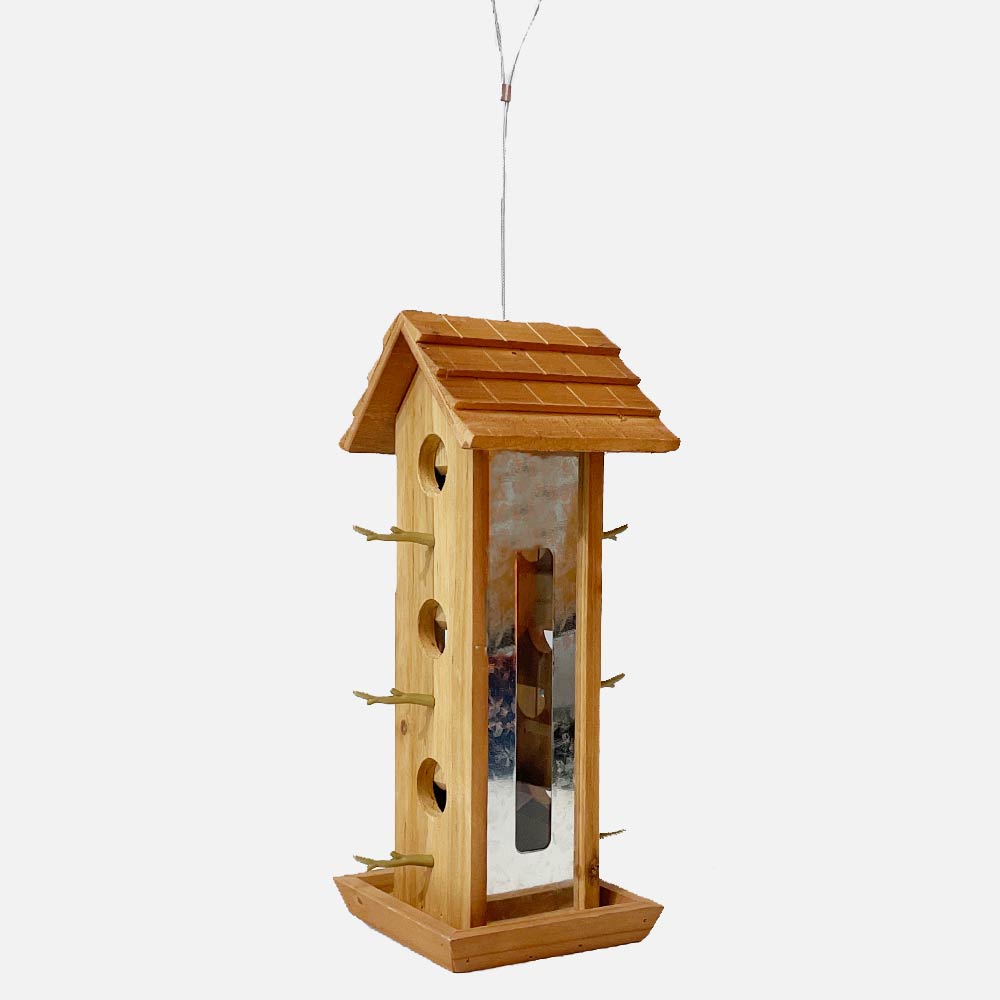Twig style perches provide natural accents on Tin Jay Wild Bird Feeder made of cedar. Holds 2 lbs of seed. Clean your birdfeeder every two weeks with mild soap and water for healthy birds.