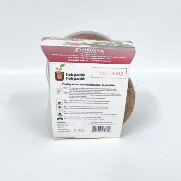 Includes baby tomato seeds, coconut coir growing medium, coconut coir pot and a plastic saucer