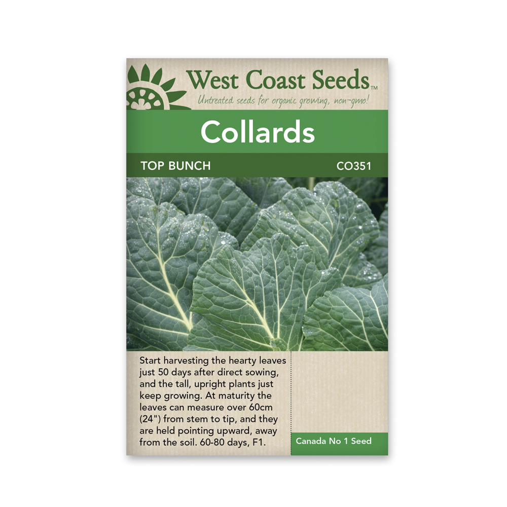 This is the earliest maturing collard we know of. Start harvesting just 50 days after direct sowing, and the tall, upright plants just keep growing. At maturity the leaves can measure over 60cm (24″) from stem to tip, and they are held pointing upward, away from the soil. The petioles are long and substantial for easy bunching, and the plants are highly uniform in size and shape. The bluish green leaves of Top Bunch collards are just slightly savoyed, thick, with large cell walls. Once cooked, the flavour is rich and savory – very nice in soup or simply steamed on its own. Use succession planting from spring to the height of summer for a constant supply of thick, nutritious greens.