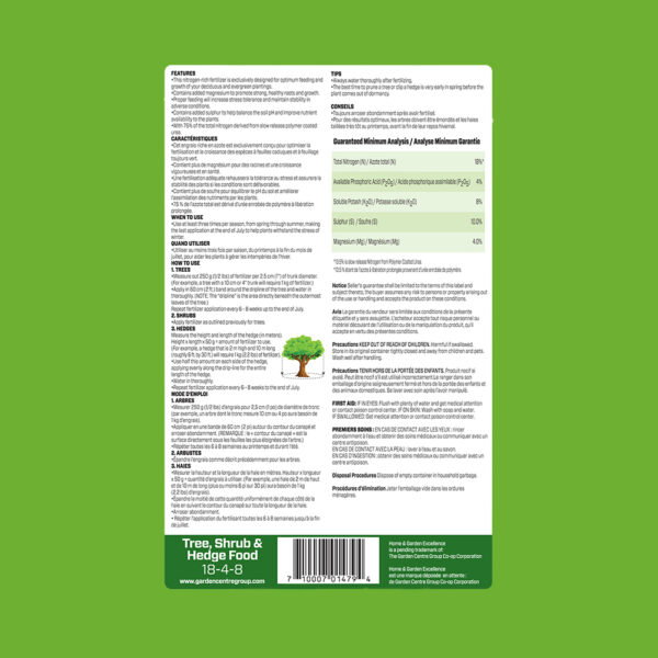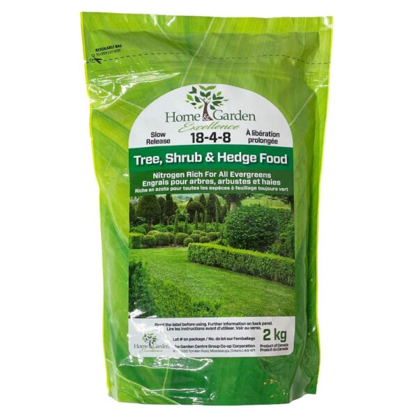 Our Tree, Shrub & Hedge Fertilizer contains magnesium to promote strong, healthy roots and growth. Sprinkle it around the base of all of your trees and shrubs each and every spring time. Proper feeding will increase stress tolerance and maintain stability in adverse conditions. This blend also contains sulphur to help balance the soil pH and improve nutrient availability. Our 18-4-8 slow release formulation comes in a 2kg resealable bag.