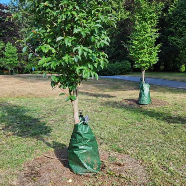 Reduce the stress and gently water newly planted or existing trees easily with this zip up tree watering bag. The woven material is safe to use with nutrient additives and one bag fits trees up to 4″ in diameter. Multiple bags can be zipped together to accommodate large tree trunks. This bag holds up to 75 litres of water and measures 30″ at the base when filled. Water will slowly disperse in 6-10 hours by way of micro-perforations along the bottom seal. You can also use the tree watering bag to soften hard, compacted soil prior to digging.