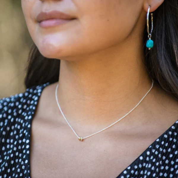 This piece is part of Johanna Brierley’s Lucky Stone Collection. As a young girl Johanna continued her family’s tradition of finding beach stones with natural holes. Because no one knows exactly what causes the holes, these stones are thought to be good luck. Each piece in this collection incorporates a sterling silver or gold replica of a stone found on the beach of Gimli, Manitoba, Canada.