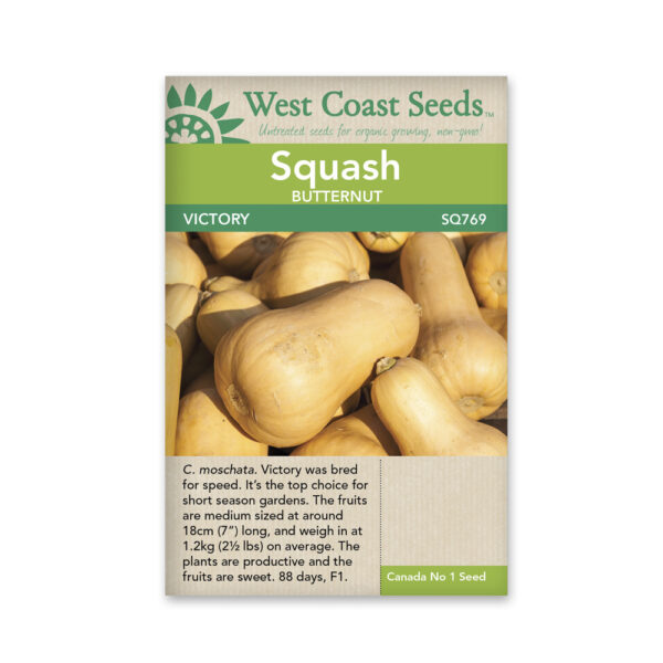C. moschata. Victory Early Butternut squash was bred for speed, so it matures much earlier than the others. It’s the top choice for any short-season garden, producing before the onset of cold weather. The fruits are medium sized at around 18cm (7″) long, each weighing around 1.2kg (2.5 lbs). The flesh is fine and richly flavoured, without a lot of fibres. Avoid overhead watering with squash plants to delay the arrival of powdery mildew in late summer. Plant in rich, fertile soil in full sun and give each plant lots of room to grow in.