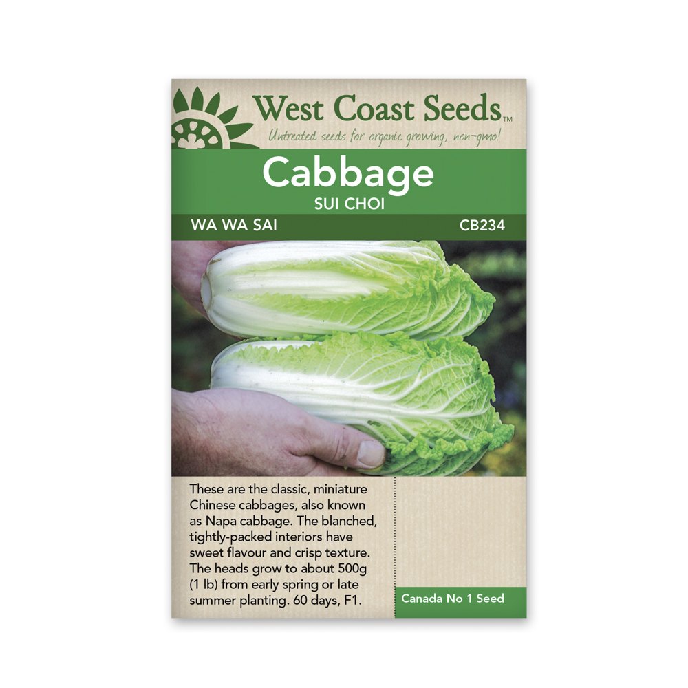 SUI CHOI. Wa Wa Sai cabbage seeds produce classic miniature napa cabbages or sui choi. The heads weigh approximately 500g (1 lb) each from spring or autumn sowing. And they are ready to harvest just 60 days from transplanting. Space plants around 20-30 cm (8-12″) apart in the row. They have a lovely sweet flavour and crisp texture that works so well with noodle dishes. Sui choi is dramatically reduced in volume when cooked. Remove the loose outer wrapper leaves to reveal a tightly packed urn-like oblong napa cabbage within. This is an excellent choice for making kimchi at home. Wa Wa Sai has high resistance to clubroot.