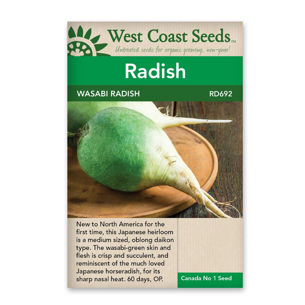 New to North America for the first time in 2017, this Japanese heirloom is a medium sized, oblong daikon type. The wasabi-green skin and flesh is crisp and succulent, with a strong heat reminiscent of the much loved Japanese horseradish paste. The flavour is sharp and tear-inducing for lovers of spice. Wasabi radish seeds also make excellent micro-greens, with the spiciness developing early on in its tiny leaves. Radishes can be grown all season but they’re easiest when sown March/April and again August through October. Optimal soil temperature: 18-24°C (65-75°F). Seeds should sprout in 5-7 days.
