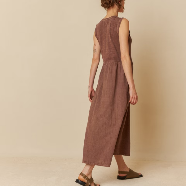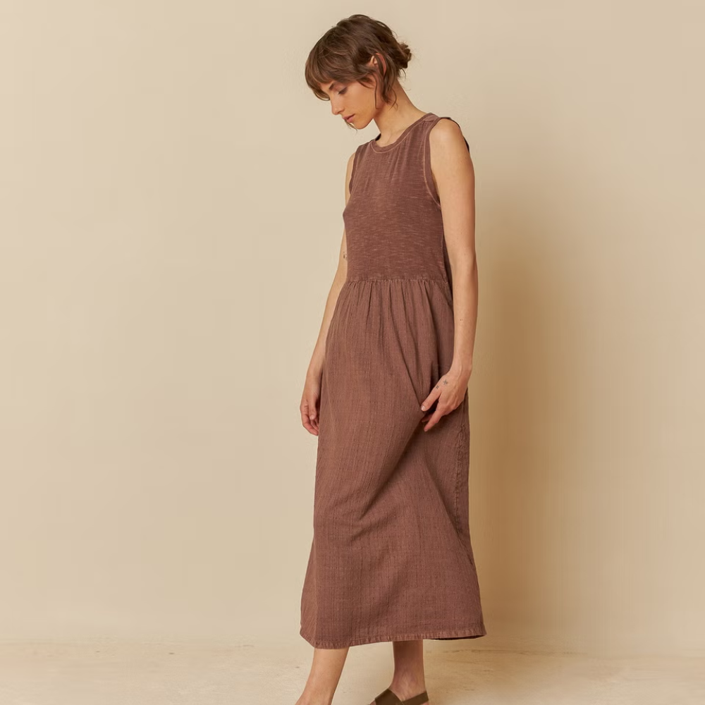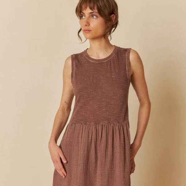 This dress is the perfect choice for summer! In dobby cotton plaid and flamé knit with washed effect, a relaxed fit, fitted shoulder and waist cut with hidden pockets in side seams.