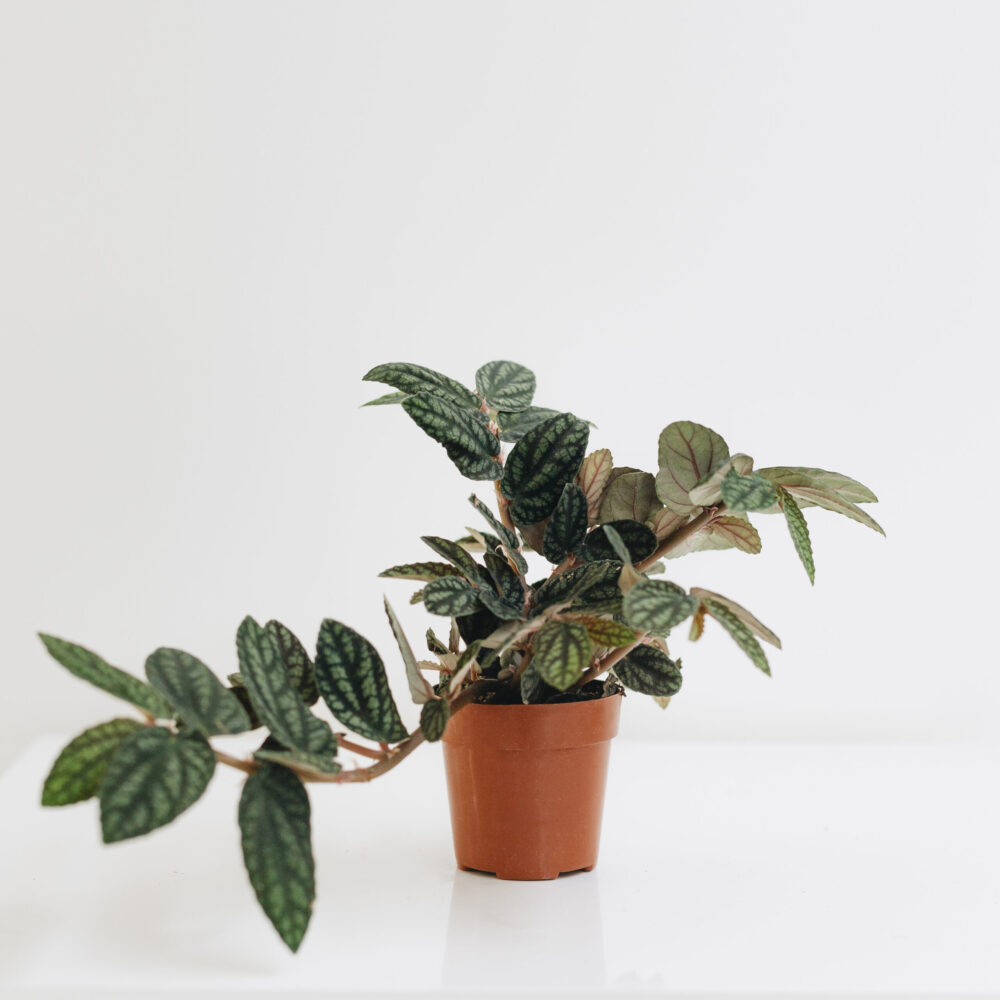 Watermelon Pellionia, commonly called Trailing Watermelon Begonia, is a vining plant featuring dark green, lanceolate leaves with a light green central band. The overlap between the two colors creates a whispy, smoky pattern which is very eye catching. Sometimes the leaves will tinge pink or purple. They are carried on long, pink stems which spill over, making this plant an excellent choice for hanging baskets and containers alike. Prefers a well-drained, humus-rich soil with moderate water. Plant it in the back of a terrarium to create a striking effect. Comes in a 3″ pot size.