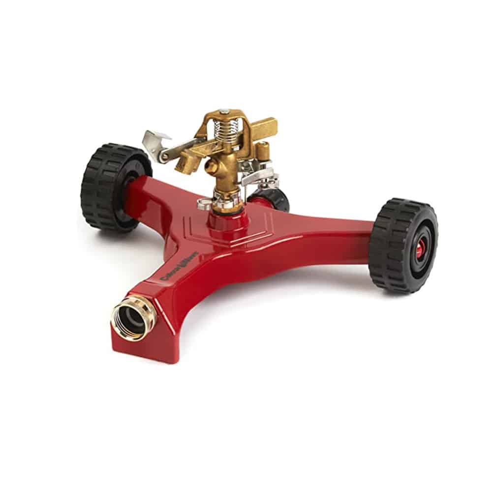 The metal base of this Wheeled Pulsating Brass Sprinkler gives it stability while its wheels make it easy to pull around. The brass spray head has an adjustable range. Its base offers an option to connect multiple sprinklers in sequence. Waters approximately 15′ x 30′ feet in area.