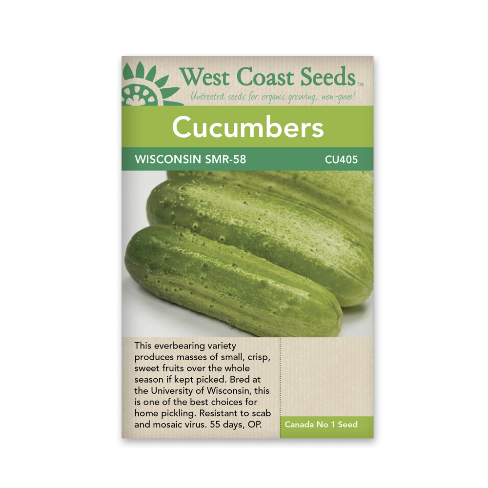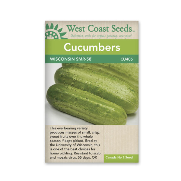 Developed at the University of Wisconsin in 1959, this ever-bearing variety produces masses of small crisp, sweet fruits over the whole growing season if kept well picked. One of the best cucumber varieties for pickling. In trial results, Wisconsin SMR-58 cucumber seeds performed better outdoors than in the greenhouse. Resistant to scab and Mosaic Virus. Be sure to keep your cucumber vines carefully picked so that the continue to produce over a long harvest season. Train your vines so that they grow vertically. This way, the fruits mature nice and straight, and evenly coloured on all sides.