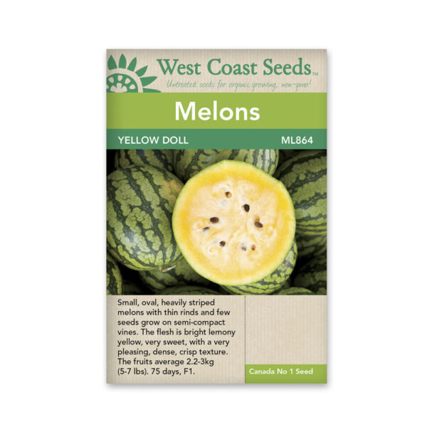 Yellow Doll watermelon seeds produce small, oval, striped melons with thin rinds and few seeds borne on semi-compact vines. The flesh from Yellow Doll watermelon seeds is bright lemon-yellow, very sweet, with a pleasing, dense, crisp texture. Fruits average 2.2-3kg (5-7 lbs). Sold by seed count. Definitely take the time to start watermelon seeds indoors in late April here on the coast, or 3 weeks after the last frost in your area. Wait until the weather has really warmed up before transplanting melon seedlings outside. Then give them lots of water and regular feedings with organic fertilizer.